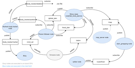 Data flow in the mobile robotic platform following the ROS publisher/subscriber communication protocol.