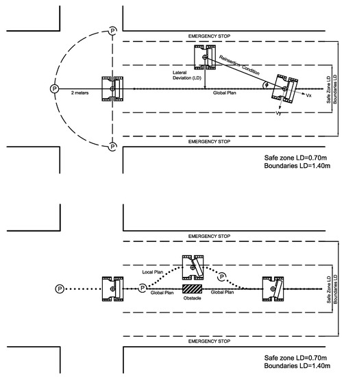 Outside the Safe Zone is the Reinsertion Zone. In this zone, the robot is driven using steering points calculated with data from the global plan (not from the local plan). This is a zone that is more adaptable to the system dynamics and velocity changes during the experiment. Within the Reinsertion Zone, the robot defines a trajectory that allows it to reinsert itself into the Safe Zone. Once the robot has entered into the Safe Zone, the robot continues with the lane-keeping task, following the global plan in the normal way. The limit of the Reinsertion Zone was 1.40 m from the global plan. This is a value that was established experimentally. If the distance from the robot to the path is greater than this value, the system executes an emergency stop. The upper image of