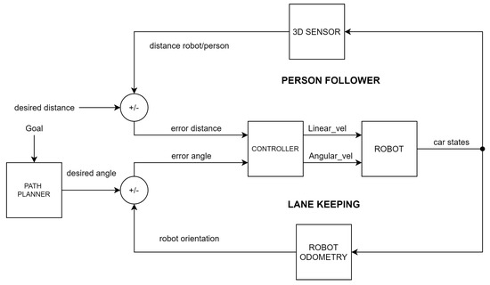 Figure 5 shows the control scheme implemented in the mobile robotic system. The person-follower controller was already explained in a preliminary study presented with this platform in [