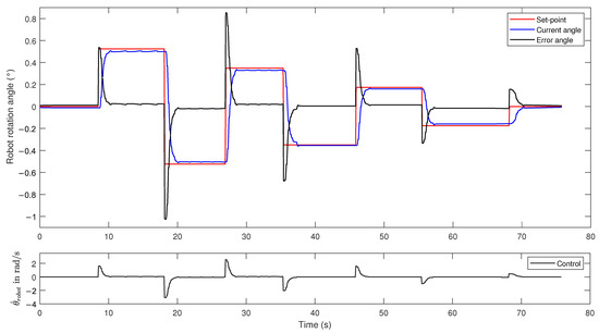 Figure 7 shows how the controller corrects the steering angle of the robot. When the robot rotates from +0.52 to −0.52 rad, it performs an angular rotation of 1.04 rad, which is one of the highest values of steering angle expected during the lane-keeping task. To make this correction, the control signal generated is approximately 3 rad/s. This value is far less than the limit of the angular velocity of the robot (7.33 rad/s). This means that the controller gain can be further increased to achieve a faster correction; however, the angular acceleration of the robot prevents us from forcing the control action excessively, since the system can become unstable, i.e., once the robot reaches the set point, it may not stop, which would cause the robot to start spinning. An attempt was made to incorporate a derivative action in the controller to make a speed correction, but the results were very similar.