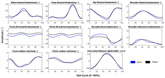 Comparison of kinematic gait cycles retrieved by the robot system (black line) and the Vicon system (blue line). The gait cycles are normalized from 0–100% and averaged for all of the iterations.