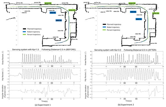 Experiment 1. Servoing system gain of and following distance of m. Experiment 2. Servoing system gain of and following distance of m. The maps show the planned path and the real path followed by the robot and the person. The kinematic joint signals (knee and hip flex./ext. in the entire experiment) in addition to the angular position of the person in the camera coordinate system.