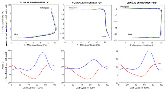 Walking experiments with MS patients in clinical environments. The upper part shows the trajectories, and the lower part shows the kinematic signals of knee and hip flexion/extension.