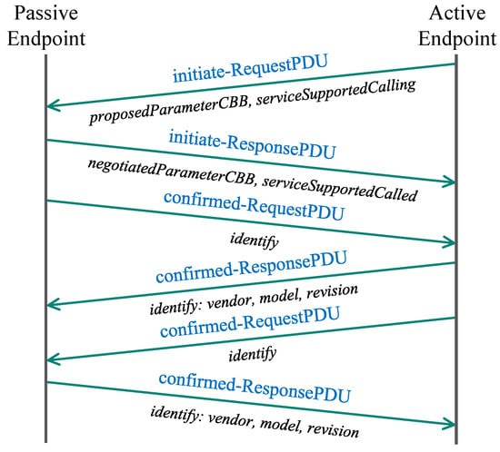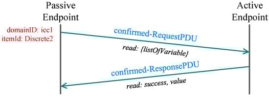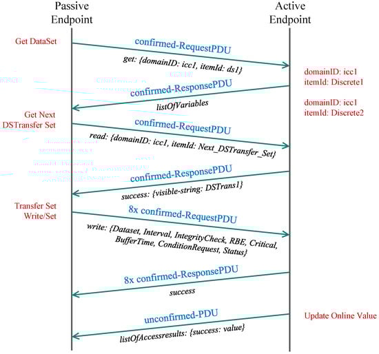 First, the passive endpoint sends a confirmed request to obtain variables belonging to the selected domain (icc1) available via an appropriate data set (dts1). The passive endpoint then replies with the list of available variables. In the following step, the passive endpoint requests the next data set transfer set (DSTS), which the active endpoint acknowledges in the subsequent message. Then, the passive endpoint further negotiates the parameters of the DSTS, such as read interval, integrity check, and request conditions. Each parameter is transferred in a separate request (8 messages in our case) and is acknowledged in the same manner. From now onwards, each change of the value on the active endpoint is followed by the transmission of new DSTS containing the new value targeted for the passive endpoint. The whole communication sequence is depicted in Figure 3.