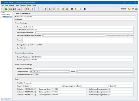 To simplify the process of TASE.2 protocol testing, we implemented the proposed generator as an Apache JMeter™ plugin that allows setting all options via a user-friendly graphical interface with the possibility of exporting the created scenarios into the file. Such an exported scenario is possible to launch on a machine without a graphical user interface. On top of that, the test case created in this way can also be part of a continuous delivery integration pipeline. Further, the use of the JMeter™ platform brings the additional advantage of combining multiple tests under one umbrella, which is difficult to achieve with single-purpose applications [,]. Therefore, integrating our generator with the already preloaded plugins makes it easy to create complex testing scenarios covering the whole communication model.