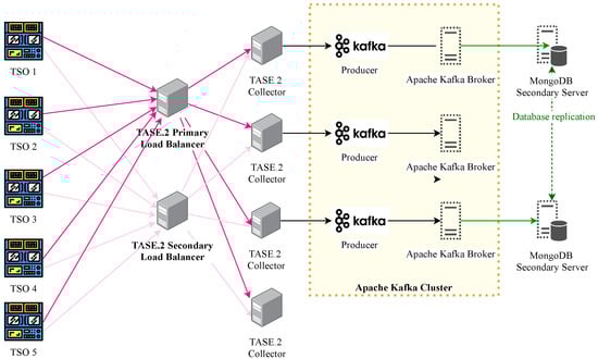 Notably, high availability is achieved via redundant connection with more than one load balancer [,]. In our testbed, these nodes are denoted as primary and secondary load balancers. On top of that, each message which is transferred towards the TASE.2 collector cluster is marked with a unique identification and transmitted via both primary and secondary connections. Thus, the load balancers continuously track the utilization of each TASE.2 collector cluster and accordingly select the most suitable collector server for transmission. The process mentioned above represents the basic principle of traffic load balancing among the TASE.2 collector nodes, which further routes the traffic toward the Apache Kafka producer brokers.