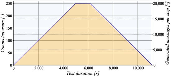 It must be noted that all experiments were performed with the TASE.2 generator that used a step testing strategy where the number of simultaneously connected endpoints was changed dynamically. In the rising phase, the generator activated a new client every 20 s, as is depicted in Figure 9. When the number of clients reached the maximum value, the generation stopped. After a certain period, the clients started disconnecting at the same rate. Notably, when the number of connected clients reached the maximum value, 20,000 messages were generated, representing a large dataset. To process such a large file, we used the open-source Pandas Python library [].