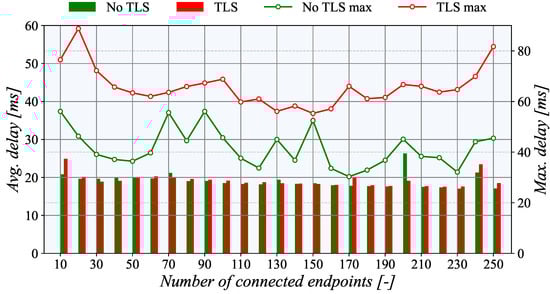 Figure 10 shows that the average communication delay to the nearest TASE.2 collector in Germany is below 20 ms. Enabled TLS encryption also leaves a nearly imperceptible effect on average delay; only the maximum delay increased noticeably. This behavior can be attributed to the overheads of establishing a TLS session when a new node is connected. Surprisingly, the communication delay is nearly independent of the number of active nodes. One may even claim that a higher number of connected nodes indicate lower delay. This behavior may be connected with the internal processes of the communication network as more demanding data traffics packet’s route is cached in the network elements; thus, they can go through with smaller delay.