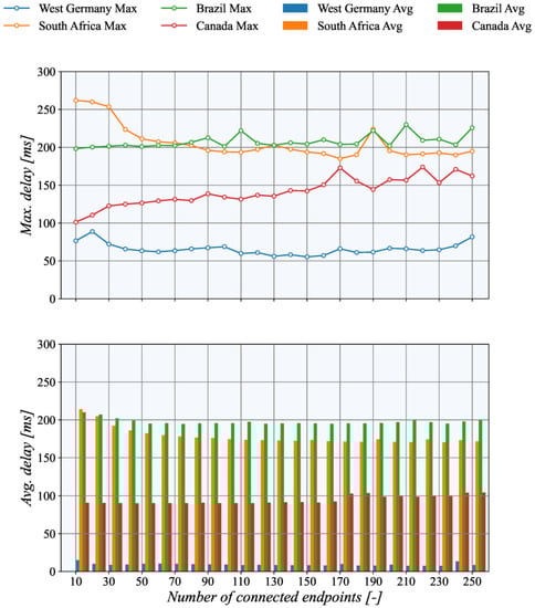 Even cursory analysis of the results confirms the basic assumptions connected with the communication distance. The lowest average delay is present at the closest node, i.e., the west Germany site. Contrary the highest average delay is between Brazil and South Africa servers. Surprisingly, in this case, the distance between these two countries is not even the longest. A slow network may cause it along the route or, more probably, the length of the communication route is not directly in line with the haversine distance. Nevertheless, the values from Table 3 should represent the lowest possible transmission delay, as they are not burdened with the overheads of higher layers.