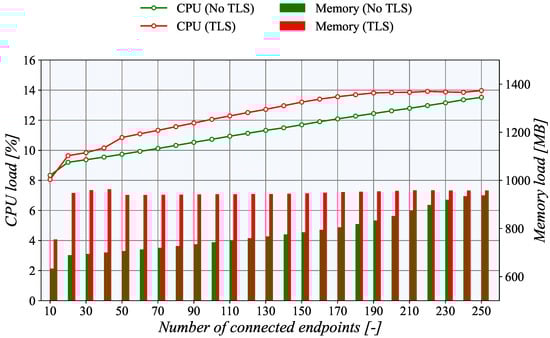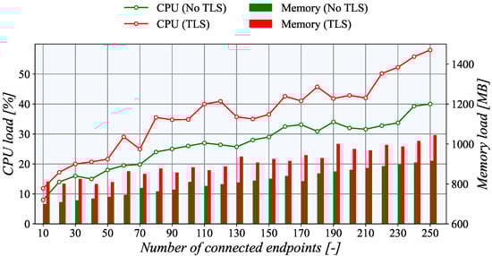 Surprisingly, for the PULL communication model, the CPU utilization is significantly higher, as depicted in Figure 14. The steepness of the curve is more prominent. Moreover, in line with the fundamental assumptions, the CPU load with active TLS is higher. For example, with the maximum number of connected nodes, i.e., 250, the difference between TLS and unencrypted TCP is almost 15%. However, with 10 connections, the difference is only about 5%. The basic principle of data acquisition most probably causes this increased CPU load of the PULL scenario. In this case, the generator side creates multiple instances of passive TASE.2 nodes which have to receive and process the incoming requests for the data readouts. On the other hand, in the PUSH model, the updated values are transmitted to the server with each update. Basically, it means almost half of the operations compared to the PULL scenario.