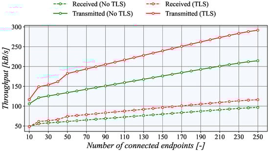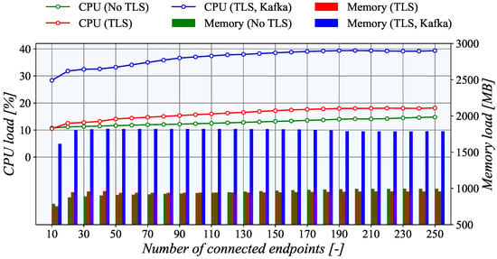 The generator’s utilization remains below 15% on the generator side and does not overcome 20% on the collector node even with the maximum number of simultaneously connected endpoints. As can be seen, the TASE.2 collector CPU utilization rises almost linearly with the increasing number of active clients. However, when the number of clients reaches 190, the TLS CPU utilization reaches its maximum value and does not increase with the rising number of active connections. The difference between TLS and unencrypted TCP is also only marginal at a maximum of around 3%. Furthermore, without the Apache Kafka broker, the CPU utilization of the TASE.2 collector server is nearly identical to the generator side. Nevertheless, when Apache Kafka is employed, the CPU load rises significantly by almost 20%. It is a clear indication that the main bottleneck of our system is not the TASE.2 communication itself but the subsequent message processing. Overall, the described findings show that, if necessary, another instance of the generator for the PUSH model can be run concurrently, and the number of generated endpoints can be increased up to 500 or 750 simultaneously active clients with the current hardware.