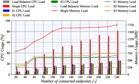 Our initial results confirm that the load balancing is working as the CPU load was evenly distributed among all servers, i.e., S1, S2, and S3. It is also clear that the CPU utilization increases linearly with the number of active connections. However, in the case of memory load, the results differ significantly. The memory usage still rises with the number of connected clients, but it is not a linear dependency. Notably, it resembles a staircase pattern as it steeply rises between 40 and 60 endpoints, and then it is nearly constant.