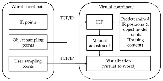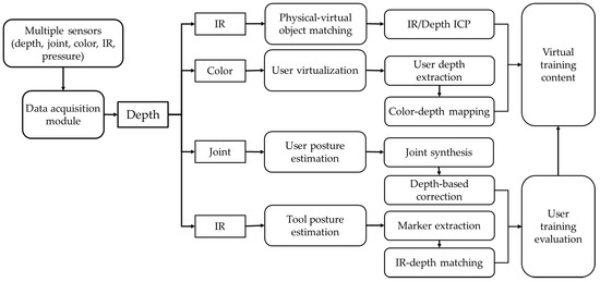An intuitive interaction with a virtual environment is needed to increase the effectiveness and efficiency of virtual training. In this study, we developed a virtual training system using real objects to improve the tangible interaction during virtual environment-based training. The proposed system tracks the real training tools by using multiple sensors to increase the immersion during user training by matching the real-world environment with a virtual environment, visualizes the virtual space by matching it with the user’s real-world space, maps the real and virtual objects to provide a realistic physical touching sensation, and uses the system to propose a training evaluation method.