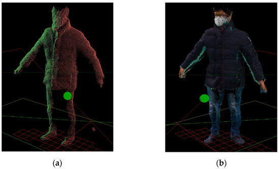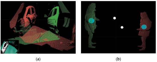 The 3D depth data visualization: (a) Captured from two Kinects (red points: left Kinect, green points: right Kinect; (b) Tracking of positions of a user and a capture tool in capture volume after background and noise removal (cyan circle: user position, white circle: capture tool position).