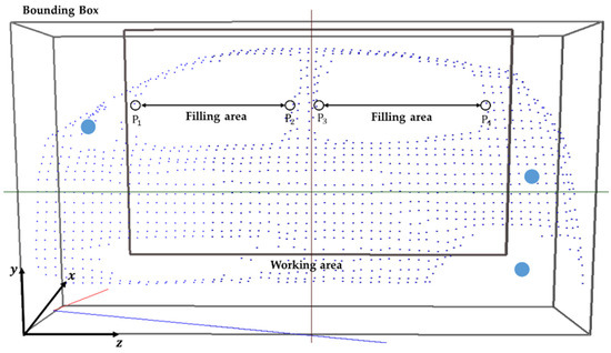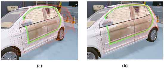 When extracting depth data from a Kinect, a problem occurs in that the glass window parts of the automobile or the parts obscured by the curvature are not recognized. Because the interaction between the steam gun and the automobile points is used to check the degree of steam injection, or the contacting status is checked when wiping with a mop, we need a process for filling in the holes. Among the many hole-filling methods, this study proposes a fast and easy hole-filling method based on a grid-based method. As shown in Figure 7, the automobile region is divided into grids for sampling. While proceeding in the -axis direction in the grid region, the region between the part where the points disappear () and the part where they reappear () is found and filled in with points. The point positions are determined by the interpolated positions between the first and second points () and (). The IR marker positions, and the automobile’s sampling points are transmitted to the content to match the automobile body in the real-world coordinate system and the automobile model position in the virtual coordinate system. Because the automobile has a rigid body with a constant shape, it is easy to know which part of the virtual model to match. After extracting the required points from the automobile model in advance, the ICP algorithm is applied to arrange them. For some errors, the final positions were matched by applying a fine adjustment manually. Figure 8 shows the process used for matching the positions corresponding to the IR data and the virtual automobile model in the virtual coordinate system to the IR points and the automobile sample points in a real-world coordinate system. Figure 9 shows the matching result of the sample points between the real automobile and virtual automobile model.
