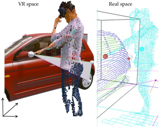 Furthermore, for visualization of the user in a virtual environment, the point and color values of the user model recognized by multiple Kinects are extracted, and the voxel sampling introduced earlier is applied to simplify the number of points of the user model (approximately 10,000 sample points are used) and thereby improved the visualization speed. The contents of the user model are virtualized by extracting the depth data and the corresponding color data, and the positions of the IR markers attached to the HMD are used to track the user position within the virtual environment. In this study, unlike conventional virtual experiences in which only partial body models are seen, a user can see a model that looks like him/herself in the VR environment, as shown in Figure 10, thereby increasing the immersion in virtual training, and providing an environment that facilitates the same interactions of the real-world job training.