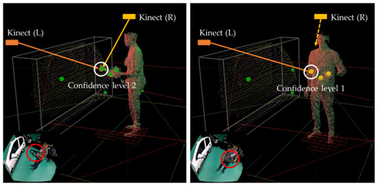 In multiple Kinects, six (three for the steam gun, two for the mop, and one for the HMD) marker positions are tracked, and a pair of markers at a position within the error range based on the Euclidean distance is integrated into a single marker. If the 3D value input is close to a marker within the existing storage, it is input there; otherwise, it is input into a new storage. The new storage is moved to the existing storage, and the next marker value is tested. If the marker classification is completed, the positions of the markers in the same storage are integrated into the same marker position. If there are two or more marker positions in the storage, a value of 2 is assigned as the marker confidence level, and if there is only one marker position, a value of 1 is assigned. Because a depth map is used, even the 3D position of a marker seen by only one Kinect can be tracked. Figure 12 and Figure 13 show examples of the classification of markers and the confidence levels based on the positions of markers that can be tracked through multiple Kinects, respectively.