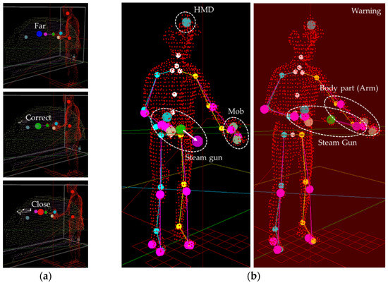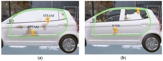 As shown in Figure 14, if the steam gun is pointed toward the sampling points of the automobile body within the predefined region, the intersection position is calculated according to the distance () and direction () of the steam gun. In the training content, the spraying distance and direction of steam can be set. Based on this, “steam” is evaluated based on the degree of interaction with the sampling points of the automobile body, and points are added only when the steam gun is within an appropriate distance (set to 20–35 cm as in the case of an actual steam car wash) after pressing the button. For example, if the distance between the intersection points and the steam gun is too far (more than 35 cm), the steam is not allowed to be applied to the surface of the automobile when sprayed, and a voice warning informs the user that the steam gun is too far away. If the steam gun is too close to the car (within 20 cm), information on being too close to the vehicle is provided, and at the same time, the score for the distance to the car is reduced. Furthermore, if the user is spraying steam toward his/her body, the user’s safety score is reduced, and a voice warning is given. Figure 16 shows examples of the evaluation according to the steam spraying distance and direction.