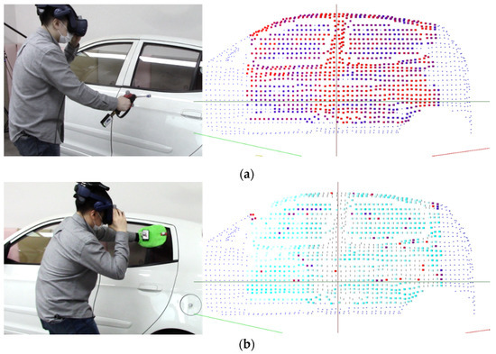 During wiping training, the user holds a mop in one hand and wipes the car within the automobile region, and contaminants are wiped only when the mop position is close to the automobile model and the input signals arrive. When wiping, only when the position of the mop is within the predetermined distance from the actual automobile body and the user wipes with a certain pressure or higher is a point given. If the user wipes too weakly or too strongly, a voice warning is provided. In the case of pressure data, because each user has a different hand size, and it is difficult to press all pressure sensors while wiping, the highest-pressure value among 13 values is used for the calculation. Figure 17 shows the changes in the sampling points after steam-spraying and mop-wiping on the surface of the automobile body.