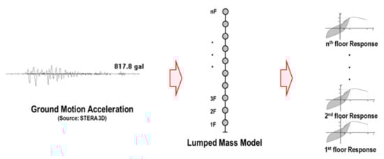 The structural responses (displacement, acceleration, etc.) of each story of the LMM under the ground motion acceleration are obtained by a time history response analysis using the STERA_3D software []. The process is shown in Figure 2.
