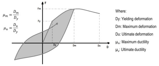 The maximum ductility ratio (ductility ratio from now on) indicates the amount of inelastic deformation over the yielding threshold as defined in Figure 3. This parameter is related to damage in the structural components of a building. Damage identification based on the ductility ratio is based on the performance-based guideline developed by JSCA [] as follows: a ductility ratio <1.0 means no damage, a ductility ratio ≥1.0 but <2.0 means minor damage, a ductility ratio ≥2.0 but <3.0 means significant damage, a ductility ratio ≥3.0 but <4.0 means severe damage, and a ductility ratio ≥4.0 means collapse. These values are shown in Table 1. Notice that the ductility ratio is always greater than 1, however, in this study, ratios less than 1 are obtained as well to differentiate between the elastic and inelastic behavior.