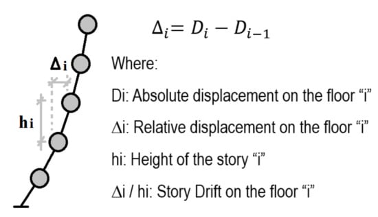 The maximum story drift ratio (story drift ratio from now on) represents the maximum relative displacement that a certain story reaches that is associated with the damage of structural components as defined in Figure 4. A larger story drift (relative displacement) after the yielding stage corresponds to a larger extent of damage. Damage identification based on the story drift ratio is based on the performance-based guideline developed by JSCA [], as follows: a story drift ratio <1/300 means no damage, a story drift ratio ≥1/300 but <1/150 means minor damage, a story drift ratio ≥1/150 but <1/100 means significant damage, a story drift ratio ≥1/100 but <1/75 is severe damage, and a story drift ratio ≥1/75 means collapse. These values are shown in Table 1.