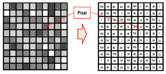 An image is processed by a computer as a grayscale image (image from now on) represented by an arrangement of numbers. For example, in Figure 8, the right matrix contains numbers between 0 and 255, each of which corresponds to the pixel brightness in the left image [].