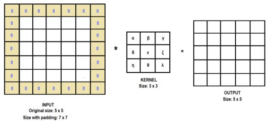 In the CNN method, images are used as input data, and for every input data set, the features of the input data are extracted by the convolution of the kernels. However, this convolution step loses information that might exist on the border of the image because they are only captured when the kernel slides (the kernel has to start and finish its process on the image borders) []. For this reason, the size of the input image is reduced as shown in Figure 9 (from input size: 3 × 3 to output size: 2 × 2). In order to obtain the same size as the original input, it is possible to apply the “same padding”, also called “zero-padding”, method (used in this study), which means the input is filled with zeros along its border as shown in Figure 10.