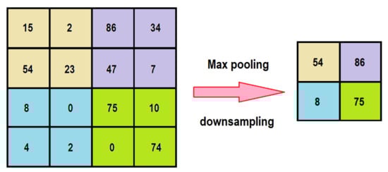 Usually, the typical convolutional layer is followed by a pooling layer to reduce the number of operations since the number of parameters increases as the network processes more kernels. A type of pooling layer is the “maximum pooling” or “max pooling” process, which takes the maximum value sliding along the feature map [], as shown in Figure 13.