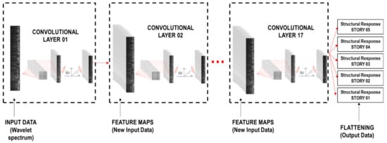 Previous studies have not fully investigated how to define the damage level of each floor of a structure from the time–frequency distribution of the observation data of a single sensor. The Japan Structural Consultants Association (JSCA), an organization of building structural engineers in Japan, uses three parameters of safety criteria used on the assessment of a building: absolute acceleration, ductility ratio, and story drift ratio []. Acceleration is related to damage in nonstructural components, and ductility and story drift ratio are related to damage in structural components. It is worth pointing out that the use of only one sensor implies a low-cost investment. This study proposes a methodology to predict the absolute acceleration, ductility ratio, and story drift ratio on each floor under earthquake conditions using machine learning. In the beginning, the earthquake responses of a model building are calculated under the scaled earthquake records with several intensities (scale factors). The level of intensity is established to obtain a range of linear and nonlinear behavior of the building. Then, wavelet spectra are developed from the structural response accelerations on the upper floor of the building. The wavelet spectra are the input data of a CNN model to predict the absolute acceleration, ductility ratio, and story drift ratio on each floor, which correspond to the damage of the nonstructural and structural components of the building.
