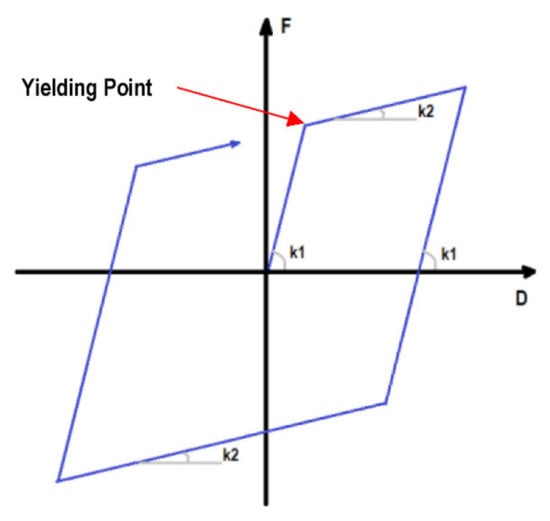 - LMM is used for the model of the building, and the bilinear hysteresis model (see Figure 5) is used to represent the nonlinear relationship between shear force and story drift for each story.