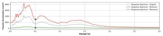 Acceleration response spectra of the “Loma Prieta” input ground motion. The red line is with the maximum scale factor such that it produces Sa(T1) = 1500 gal, the green line is with the minimum scale factor such that it produces Sa(T1) = 100 gal, and the black dashed line considers the original input ground motion.