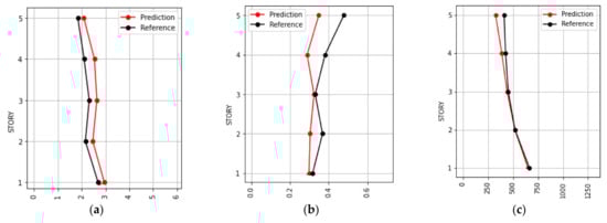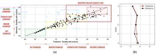 An example of the analysis results is shown in Figure 20. Figure 20a shows the ductility ratio results under the scaled Petrolia California E–W records, comparing the prediction (horizontal axis) and the reference (vertical axis). In the figure, the straight line represents the perfect prediction. The points represent the results of each story and scale factor defined in Section 2.1 and Section 2.4. Additionally, Figure 20a shows the regions that define the damage condition. The green, yellow, orange, and red regions represent the no damage, minor damage, significant damage, and severe damage conditions, respectively. The collapse condition is considered for any value greater than the severe damage condition. The dashed red rectangle encloses the region for any value that is greater than the minor damage condition and means that the use of the building is restricted or unsafe (condition for evacuating the building). Figure 20b shows an example of the prediction and reference values of each story for a scale factor that produces Sa(T1) = 900 gal.