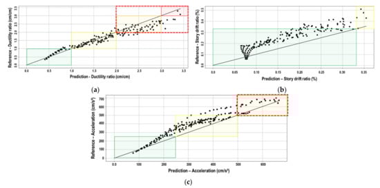 where ypred is the prediction output by the CNN model, yref is the reference output by the structural analysis, and are the mean of ypred and yref, respectively, and N is the number of samples. Table 6 shows the r-values for the validation process. The average values of the r-values of the ductility ratio, story drift ratio, and acceleration are 0.905, 0.846, and 0.829, respectively. In particular, the accuracy of the estimation of the ductility ratio is the highest.