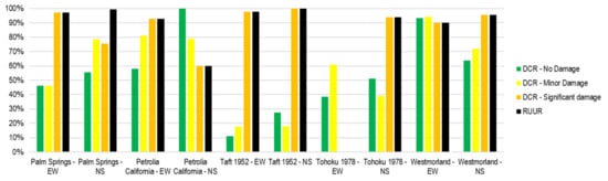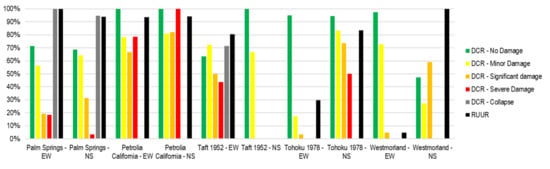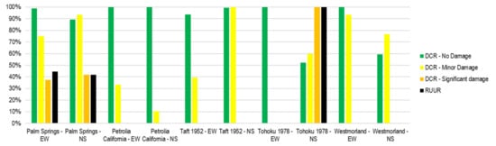 Figure 25 shows the comparison of the DCR and RUUR for the acceleration. In general, the DCR of significant damage condition is larger and more accurate than others. Few data reach DCR of severe damage and collapse conditions. In most cases, RUUR has high precision—greater than 90%.