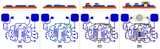 Figure 3. Schematic side views (top) and schema top views (bottom) of the multilayer demonstrator in the following fabrication steps: (A) Printing of the first conductive layer (in blue) with three printing cycles followed by annealing during 4 h at 100 °C. (The substrate is illustrated in orange in the side views). (B) Printing of the UV insulating layer (in green) with three printing cycles followed by a waiting time of 15 min, then exposure to UV radiation for 1 min. (C) Printing of the second conductive layer (in red) with three printing cycles followed by annealing during 4 h at 100 °C. (D) Mounting of electronic components where each electronic component has been fixed on its footprint by means of a conductive ink dispenser. This step is followed by annealing for 4 h at 100 °C.