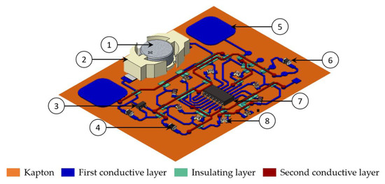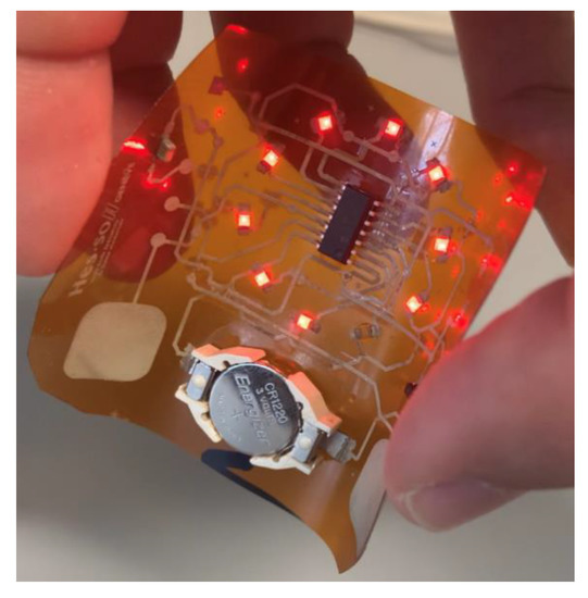 Figure 4 shows a 3D schematic view of the demonstrator. Besides the conductive and insulating tracks, the demonstrator circuit comprises: (1) One CR1225, 3 V, 50 mA battery [35], (2) One “SMTU1225-LF” battery holder [36], (3) One “MCP1700” LDO voltage regulator [37], (4) Two 1 µF capacitors [38], (5) Two printed capacitive pads, (6) One 10 kΩ resistor [39], (7) One “PIC16F1825” microcontroller [40], (8) Ten “SML-211UTT86” LEDs [41].