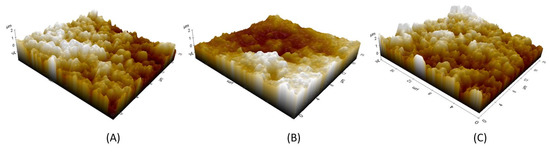 Figure 7. 3D AFM images of the following superimposed printed layers on a 20 µm × 20 µm square: (A) First layer: conductive; (B) Second layer: insulating; (C) Third layer: conductive. Z range is set from −1 µm to 2 µm.