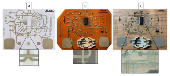 Figure 8. Photographic views of a multilayer demonstrator pad-printed on: (A) Cardboard, (B) Kapton, (C) Wooden board.