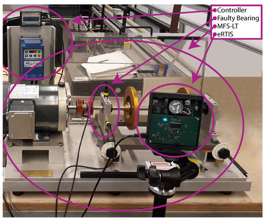 The experiments were conducted using the Machinery Fault Simulator-Lite (SpectraQuest Inc., Richmond, VI, USA), during which the focus lies on bearing defects. In particular, we used faulty bearings containing a ball defect, inner ring defect, outer ring defect, and a combination of all the previously mentioned from the SpectraQuest Inc. 5/8 Bearing Fault Kit. Combined with the reference bearing, this results in five different classes for the classification process. The MFS-LT was used to rotate a shaft supported by two bearings at 20 Hz, while vibration signals were captured with an accelerometer at 51.2 kHz and acoustic data were recorded at 450 kHz. The acoustic data were captured using the embedded Real-Time Imaging Sonar (eRTIS) [27] developed by CoSys-Lab. This data were recorded in a quiet lab environment with a minimum of background noise to ensure clean data. The entire setup is shown in Figure 1.