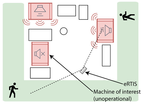 To investigate the use of beamforming for condition monitoring, the same eRTIS was used to record background noise at an industrial plant that was in full operation. The eRTIS was placed in front of a machine that could be the subject of investigation and recorded background noise during the off-time of that machine. This was done to ensure realistic spatial background noise was captured where they did not take our presence into account. Figure 2 shows a simple ground plan of the location of the eRTIS. It is located in front of the machine of interest, surrounded by other machines which were generating interfering noise. The vibration data will also be contaminated with noise, which is additive white gaussian noise.