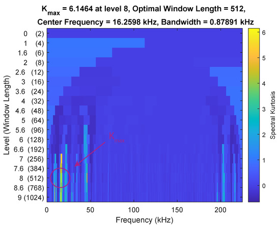 Nine-level kurtogram of noiseless beamformed acoustic data, captured at 450 kHz. The kurtogram was used to find the optimal window length for the spectral kurtosis based on the maximum value, indicated by the red circle.