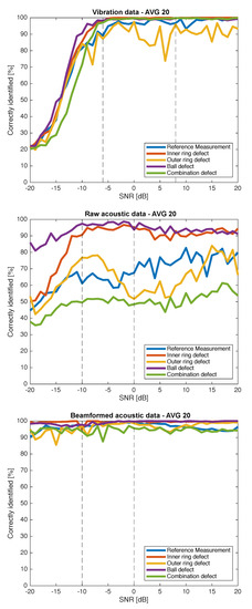 Percentage of correctly identified samples in function of the SNR. The data in the top graph are data captured with an accelerometer. The data in the middle graph are raw data taken from one microphone of the array of the eRTIS. To classify the different defects in the bottom graph, beamformed data were used. The data consist of a reference measurement of a healthy bearing as well as a bearing with an inner ring defect, outer ring defect, ball defect and a combination of defects. The dashed lines indicate realistic SNRs (realistic worst and average case) for the vibration and acoustic data. The training and classification was repeated 20 times and averaged.