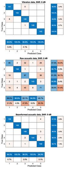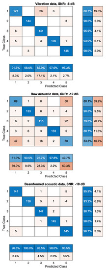To gain more insight into the classification data, the confusion matrices are shown in Figure 5 and Figure 6 for an SNR in a realistic worst-case scenario (—6 dB for the accelerometer and —10 dB for the acoustic data) and a realistic average case scenario (8 dB for the accelerometer and 0 dB for the acoustic data), respectively.