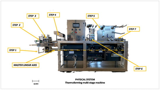 Multi-stage thermoforming machines are one of many multi-stage machines in industrial manufacturing processes. These machines comprise several sub-processes ranging from the management of the polymer film to the container and lid, including the dosage and final cut. Figure 2 shows the steps of this machine ordered sequentially.