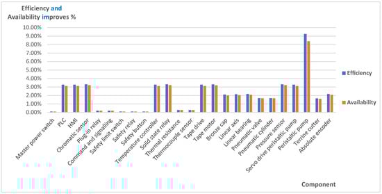 As both algorithms detected failures in some components, the MTTF was reduced. To manage the maintenance of this alteration, the MTTF value of components triggered component replacement decisions as the mean time to failure was reduced and, therefore, the component’s lifetime ended. Their Efficiency and Availability values changed (see Equations (4) and (5)).
