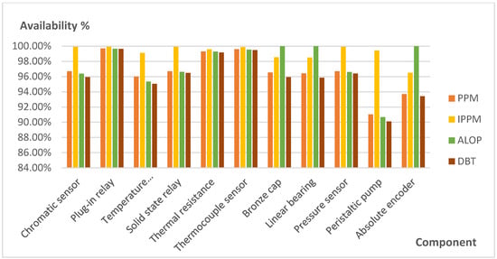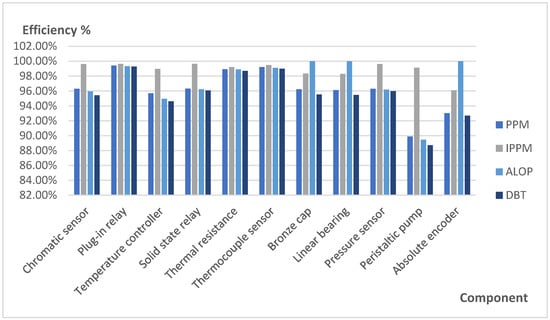 Figure 8 and Figure 9 show the comparison of Efficiency and Availability in percentage values of the components that presented unexpected failures detected by ALOP and DBT, and their values obtained in PPM and IPPM (see Table 3).