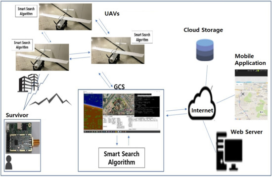 Figure 1 illustrates an overall system overview of the UAV-based location tracking system. A single or multiple UAV flies over the target disaster area and, when a signal is detected, it transmits information such as the drone’s latitude, longitude, RSSI, and ToA received from the survivor communication module to other UAVs and the GCS (Ground Control System) for data sharing. Based on the input data, the GCS and UAVs estimate the location of the survivor via the proposed Smart Search Algorithm. Specifically, the search algorithm estimates locations, updates the estimated locations of the survivor, and reduces the error between the estimated locations and the actual location. GCS is also uploading this information such as trajectories of UAVs and the estimated survivor’s location to its web server for further sharing with mobile applications.