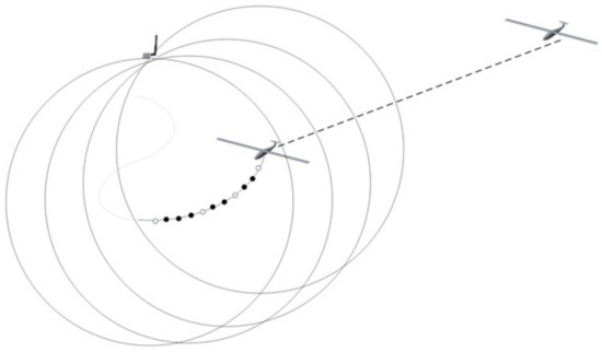 On the other hand, UAVs update their waypoints based on the estimated location of a survivor and fly toward the potential location. Figure 2 illustrates how the estimated position information indicated by the dots in this figure is continuously updated as a UAV approaches the target (The plain dots are waypoints for flight and the solid dots are temporary or local goals in flight trajectory towards the waypoints, which are generated by a trajectory builder inside UAVs).