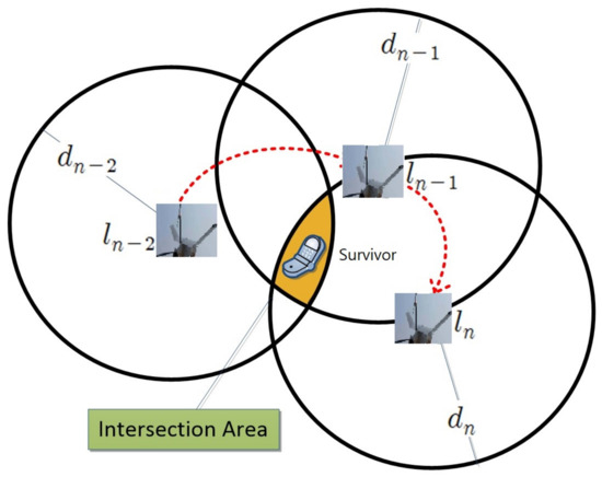 Specifically, location, is shown in Figure 5 and is the distance from a survivor to the UAV calculated based on a combination of ToA or RSSI signals. The above notation in Figure 5 is assuming only one UAV in the system and each location of the same UAV is considered as different logical anchors. We extend it to support multiple UAVs and we use instead of , i.e., means location of UAV. The distance between this UAV’s location and a survivor, , is defined as follows: